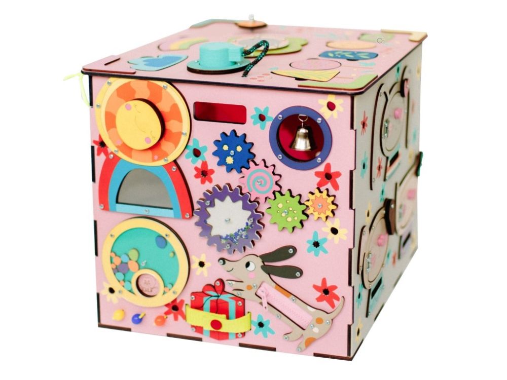 Activity board kostka s LED osvětlením XXL je originální montessori hračkou, která děti zabaví, zdokonalí jejich schopnosti a naučí je novým dovednostem. Každá strana růžového activity boardu je originální a nabízí nespočet možností ke hře, zkoumání a poznávání. Nechybí ozubená kola a kolečka, různé způsoby zapínání, tkanička, různé způsoby zavírání, korálky, bludiště, vkládací puzzle, různá překvapení i sluníčkový vypínač, který activity board kostku rozzáří.