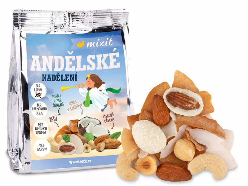 Andělíčku, strážníčku, naplň mi kapsičku. Andělské nadělení do kapsy nepotěší jen hodné děti, ale i relativně hodné dospělé. :-) Jako hlavní hvězda této sezónní limitky svítí pražené mandličky v bílé čokoládě posypané strouhaným kokosem. Přihodili jsme k nim kokosové plátky – přírodní i karamelové a směs oříšků. Je to dobrota tak nebeská jako brnkání harfy v obláčcích.