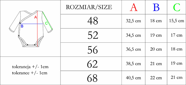 Body s dlouhým rukávem vyrobené ze 100% bavlny s certifikací Oeko-Tex Standard 100. Důvěryhodný materiál. Oděv má natahovací střih, malé velikosti mají zapínání na druky na boku a v rozkroku a od velikostí 74 do 98 cm se oděv zapíná na rameni pro snadné oblékání.