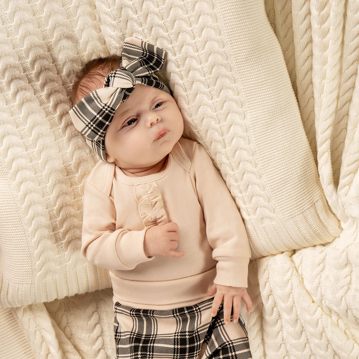 Body s dlouhým rukávem pro dívky, vyrobené z béžové bavlny, certifikované dle standardu Oeko-Tex 100. Důvěryhodný materiál. Přední díl zdobí nařasený volánový lem. Rukávy jsou zakončeny žebrovanými manžetami v odpovídající barvě. Ramenní popruhy se překrývají, což umožňuje snadné provlečení hlavy. Body se otevírá v rozkroku pro snadné přebalování.