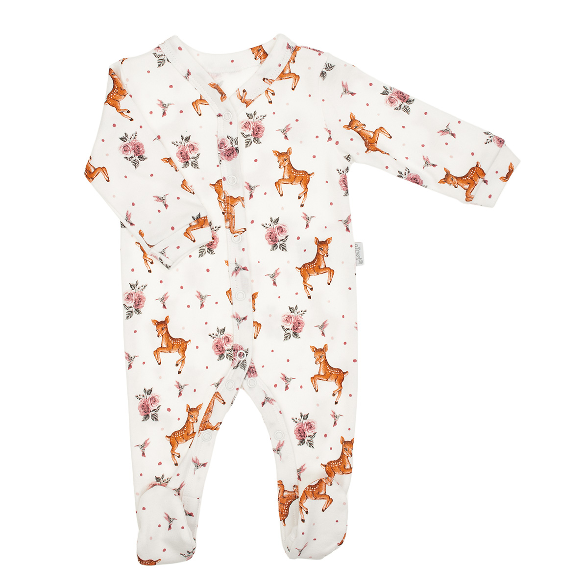 Měkký overal s dlouhým rukávem z kolekce Lala. Vyroben z bavlny s potiskem jelena, ptáka a růže. Jsou použity vysoce kvalitní materiály, bezpečné pro dětskou pokožku. Tento overal je nezbytností pro každého rodiče. Zapíná se po celé délce oděvu pomocí praktických patentních knoflíků bez obsahu niklu pro snadné přebalování. Doporučuje se od prvních dnů dítěte.