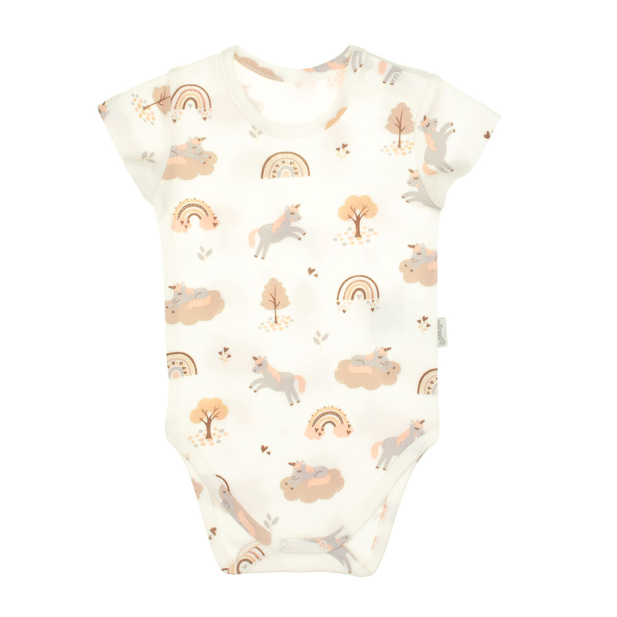 Body s krátkým rukávem pro dívky, vyrobené z krémové bavlny s motivem jednorožců, mraků a duhy. Materiál má certifikaci Oeko-Tex Standard 100 Trustworthy Textiles. Perfektně ladí s ostatními produkty z kolekce Rosy.