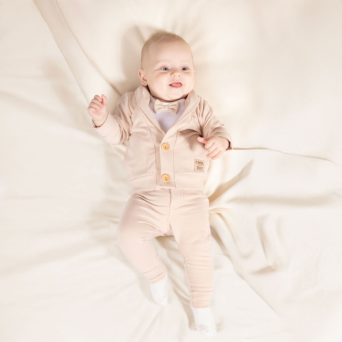 Pohodlná, praktická a zároveň mega elegantní mikina pro kluka z kvalitní béžové teplákové bavlny. V rukávech a v pase jsou všité elastické pásky. U krku má ozdobný stahovací límec. Zapíná se na dřevěné knoflíky, vpředu s nášivkou Cool Boy. Materiál je certifikován podle Oeko-Tex Standard 100 Trustworthy Textiles.