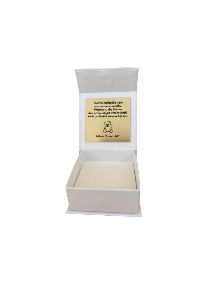 Tato dárková krabička je více než jen obal – je to láskyplné gesto. Uvnitř najdete zlatou destičku s dojemným českým přáním k narozeninám, doplněnou obrázkem roztomilého medvídka. Krabička je vyrobena z kvalitního bílého kartonu s jemným polstrováním, které šperk chrání a zároveň elegantně prezentuje. Perfektní volba pro prstýnek, náušnice nebo přívěsek.