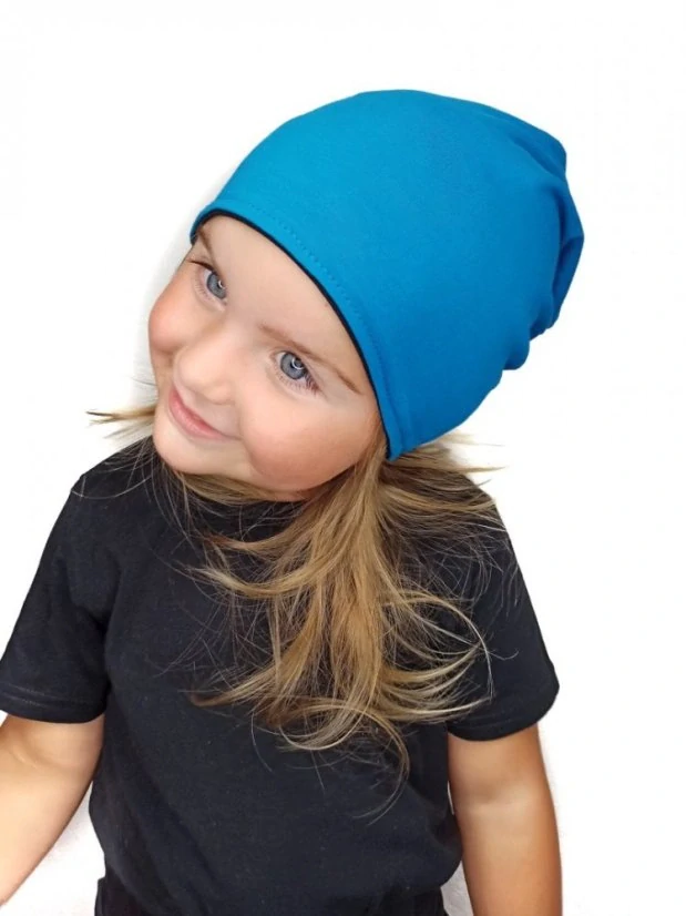Dětská čepice bavlněná, oboustranná, černá+tmavý tyrkys, vel. MNa objednání199 Kč/ ks164 Kč bez DPH