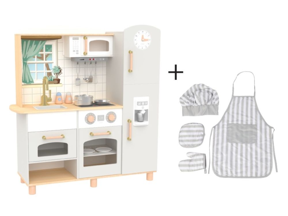Stylová dětská kuchyňka doplněná o bohaté příslušenství a textilní kuchařský set ZDARMA, okouzlí malé kuchařky i kuchaře. Dřevěná kuchyňka ve skandinávskému stylu, se základními spotřebiči, parádními doplňky a zvukovými efekty, je vhodná do každé místnosti. Díky této krásné edukativní hračce si děti vyzkouší vaření, pečení, chystání pokrmů, umývání nádobí a další činnosti bezpečným dětským způsobem. Při hře v dřevěné kuchyňce děti zdokonalí své dovednosti a ještě si užijí spoustu zábavy.