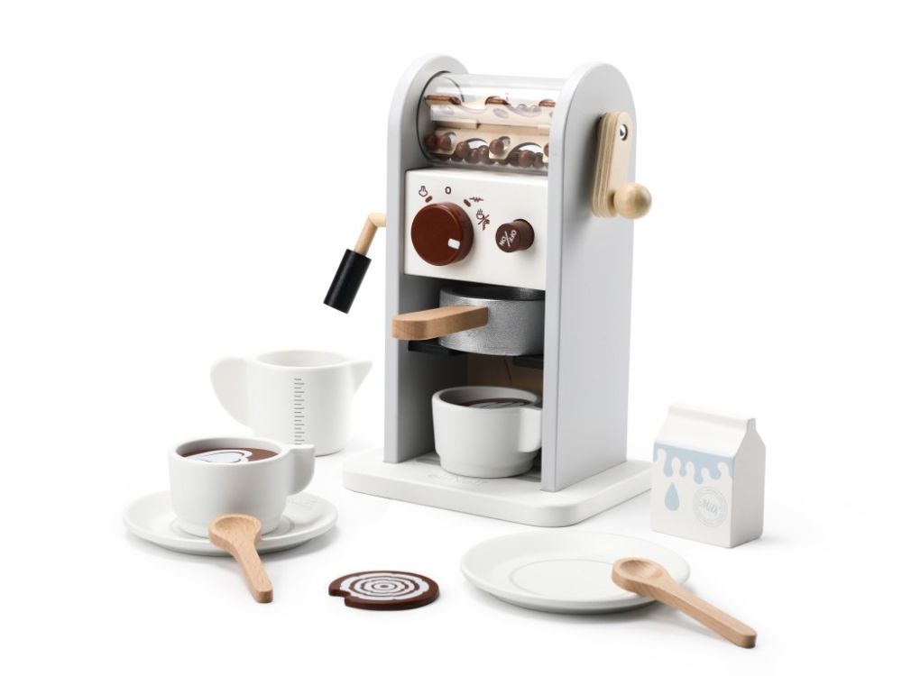Dřevěný dětský kávovar v neutrální kombinaci barev - bílé, šedé a přírodního dřeva, okouzlí svým designem a příslušenstvím nejen děti, ale i dospělé. Originální dětský kávovar s mlýnkem na zrnkovou kávu, s tryskou pro napěnění mléka, s vypínačem, s ovládacími kolečky a parádním příslušenstvím promění dětský pokoj v kavárnu, kde děti mohou denně připravovat lahodnou kávu nebo zdobené cappuccino pro své panenky, plyšové hračky, rodiče i kamarády. Dřevěný kávovar podporuje a rozvíjí dětské dovednosti, děti hrají role, vyzkouší si přípravu kávy bezpečným dětským způsobem. Nechte se pozvat na lahodnou kávu z čerstvě pomletých kávových zrnek, ozdobenou srdíčkem.