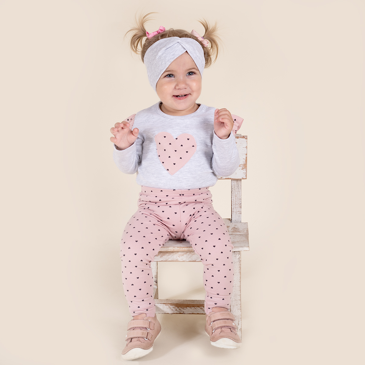 Dívčí legíny z práškové bavlny s grafitovými srdíčky. Má příměs elastanu, což znamená, že se materiál nedeformuje, a zároveň je příjemný na dotek a dobře sedí. V pase mají pohodlnou gumu, která netlačí na bříško. Legíny jsou ideální pro různé aktivity našeho dítěte.