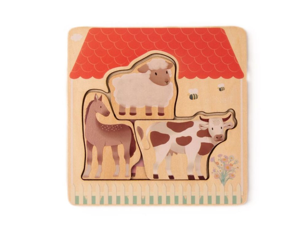 Vícevrstvé dřevěné puzzle Farma se zvířátky v jejich skutečné, reálné podobě, představuje hned několik hraček v jednom - puzzle, vkládačku i skládačku. Zvířátka z farmy některé děti trochu potrápí, poskládat je totiž musí hned do několika vrstev na sebe. Při skládání puzzle děti zdokonalují jemnou motoriku, koordinaci očí a rukou, logické myšlení, prostorovou představivost, hra učí děti trpělivosti a soustředit se.