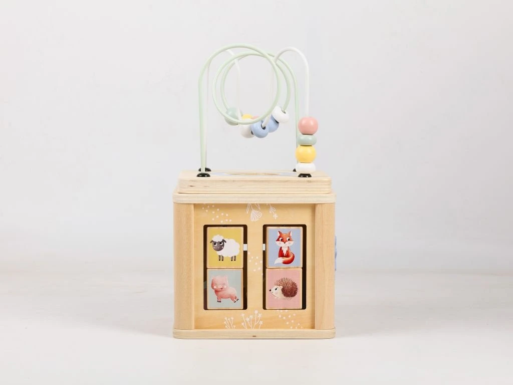 Kostka obsahuje různé aktivity, které podporují učení a objevování. Děti si mohou hrát s ozubenými kolečky, posunovat korálky na drátěném labyrintu, otáčet destičky s obrázky zvířátek nebo hledat správné tvary do otvorů. Každý prvek je navržen tak, aby rozvíjel jemnou motoriku a logické myšlení.