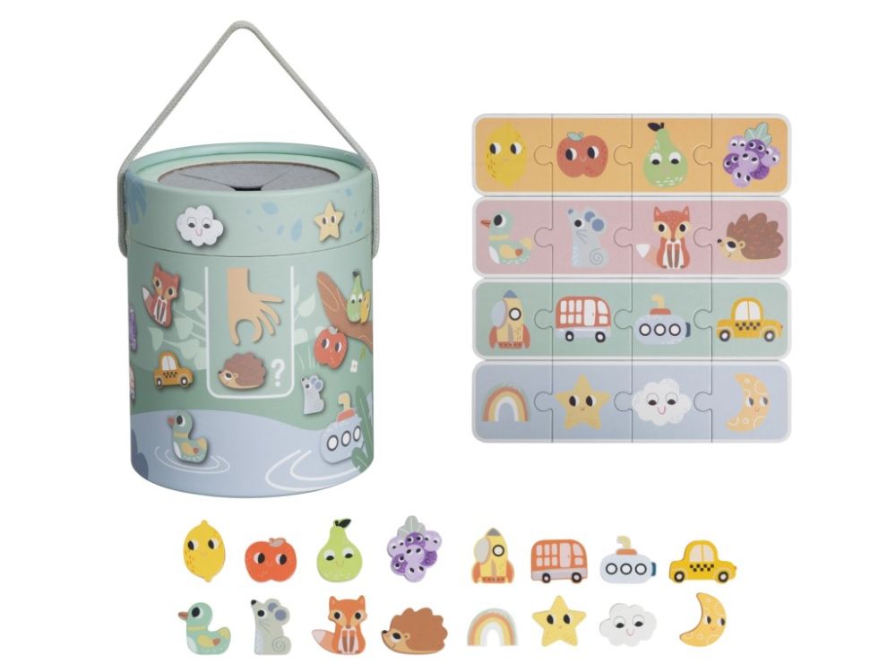 - Balení obsahuje: kyblík, 16 dřevěných předmětů v podobě ovoce, zvířátek, dopravních prostředků a motivů z oblohy, 16 hracích kartiček v podobě puzzle.