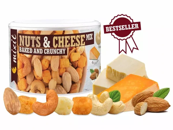 Mixit Mix pražených ořechů a křupavých sýrů - slaná směs, kterou upotřebíte jako pohoštění na večírky, filmové večery a setkání s přáteli.