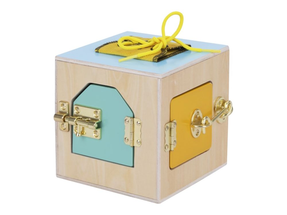 Activity board kostka z masivního přírodního dřeva si pro děti připravil několik dvířek, nejrůznější otevírací mechanismy, barevnou tkaničku a knoflík. Všechny prvky na montessori kostce zdokonalí dětské dovednosti a naučí děti praktickým dovednostem, které jistě využijí i v běžném životě.