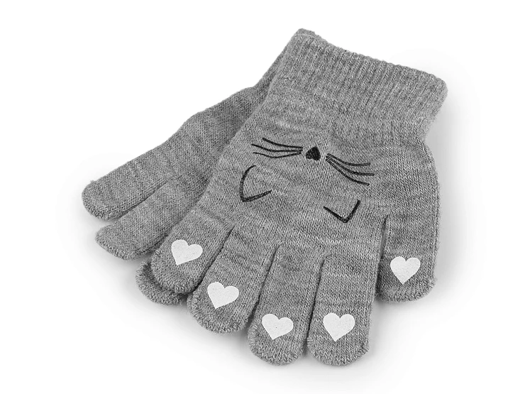 Dětské pletené rukavice jsou na horní straně ozdobené gumovým potiskem kočky a srdíčky. Jsou vyrobené z pružné, hřejivé pleteniny, která se ruce skvěle přizpůsobí. Díky pružnému lemu kolem zápěstí pevně drží - nesklouzávají. Jsou ideálním doplňkem do sychravého podzimního a zimního počasí.